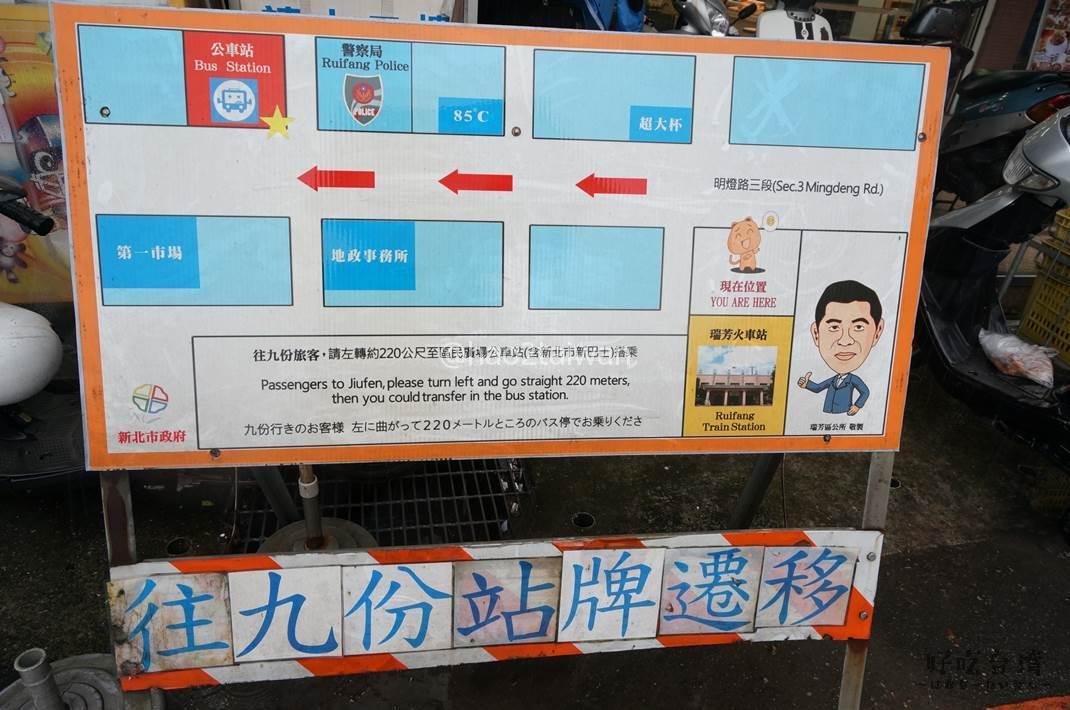 日本語でも案内を書いていただいているので安心。瑞芳駅を降りて、駅前広場の道を左方向(九份)方面に歩いて220mくらいのところに新停留所があるようです。まあ、少し歩きます。