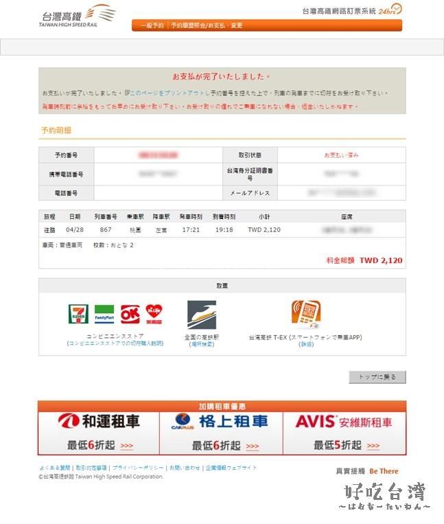 本人認証が完了して支払が完了すると、次のような画面が表示されてオンライン予約が完了です。「このページをプリントアウトし」を押すと予約書が印刷できますので、印刷した予約書を台灣高鐵の駅窓口に持っていくと切符を受け取ることが出来ます。