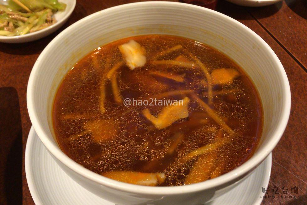 酸辣湯(辛くて酸っぱいスープ)。一般的な中華料理店で飲むことが出来る酸辣湯と違って、酸味と辛みが抑えられており、辛いのが苦手な方でも大丈夫。