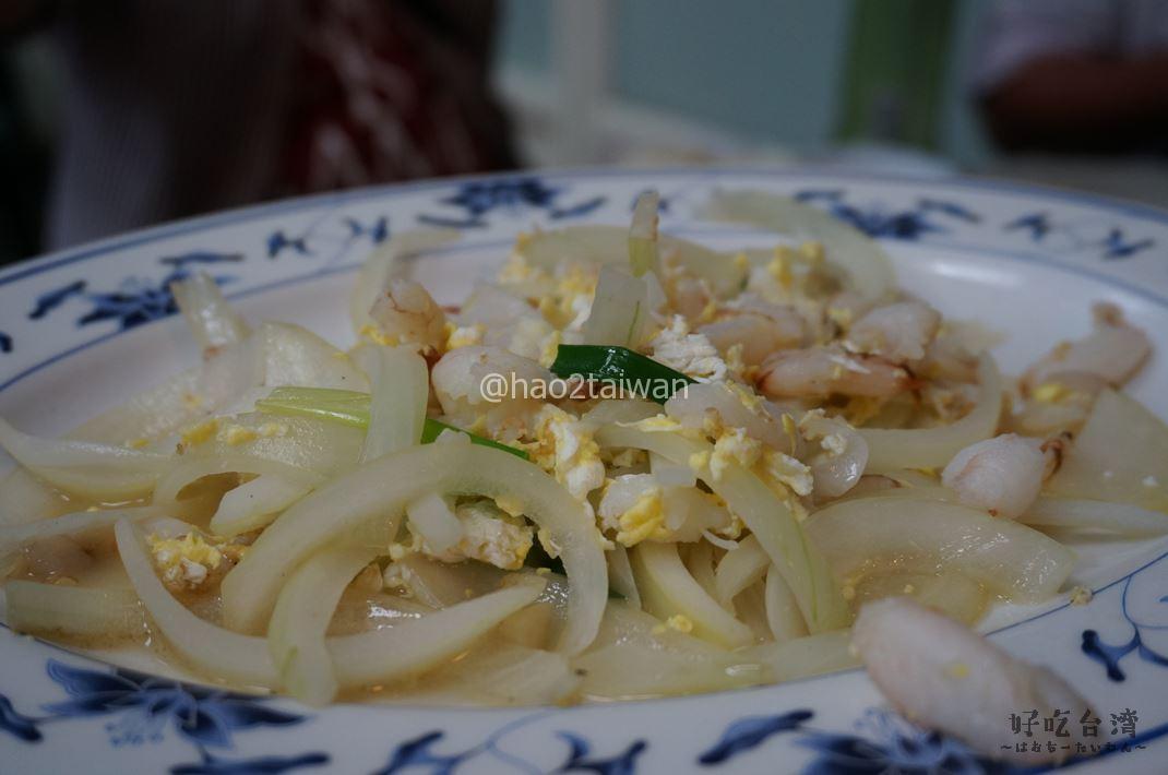 これは蟹(カニ)と玉ねぎ、卵の炒め物。