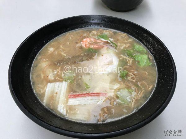 まずは、鍋燒意麵。魚介系スープから漂う強い香りが鼻腔をくすぐります。同行者に頼んで一口食べてみたところ、麺はなかなかのコシ。魚介系スープと意麵と良く絡んで、なかなかの食べごたえ。寒い時に食べるのにぴったりな濃い目のスープが特徴。飲んだ後の〆にも合う。