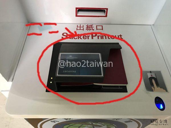 使い方は非常に簡単。旅客通關紀錄列印機のディスプレイ下に、パスポートを読み取るスキャナーがあるので、そちらに画像のような形でパスポートを置きます。