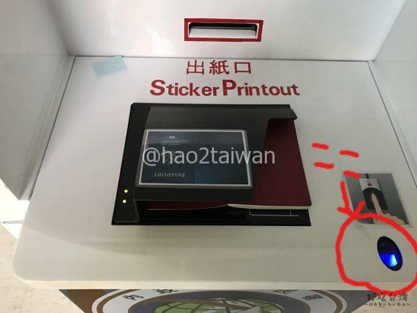 断っても仕方ないので、職員さんにパスポートを渡すと、パスポートを開いて機械のとある場所に置いて画面タッチ。そしてとある場所に指を置けとの指示。指示に従って指を置くとあらびっくり。シールが出てきたじゃないですか。