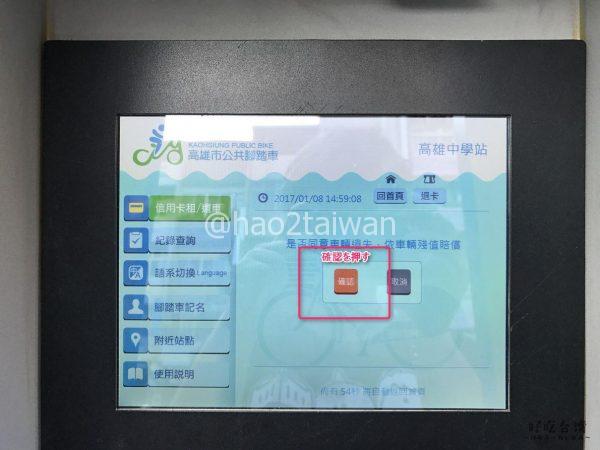 次の画面では、是否同意車輛遺失・依車輛殘值賠償(自転車を紛失したりした場合は、弁償してください)と表示されます。ここで利用許諾に同意せず、取り消しを選ぶと自転車を借りることは出来ません。確認ボタンを押して次へ進めましょう。