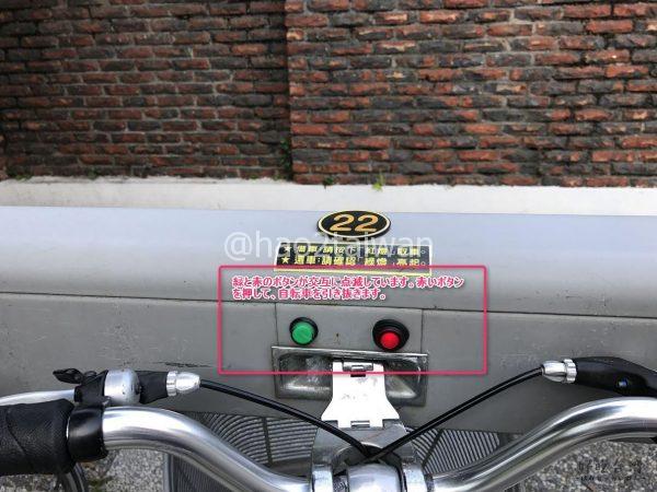 さあ、レンタルする自転車の所に行きましょう。自転車の所に行くと分かりますが、レンタルが出来る状態になっていると、緑と赤のボタンが交互に点滅しています。ここで、赤いボタンを押した後に、自転車を力強く後ろに引くと、連結部分から取り外せます。