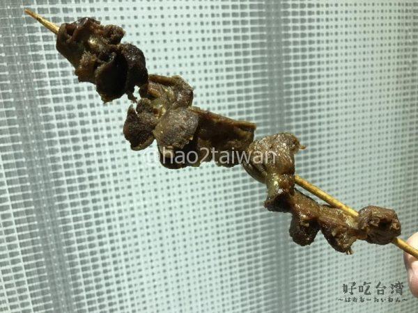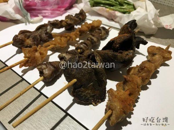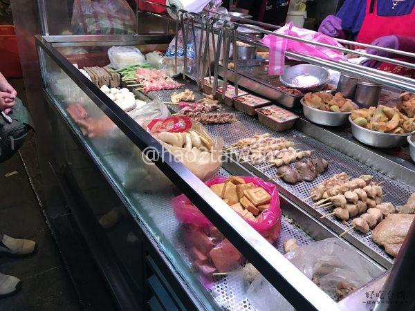 屋台の軒先には、こんな感じで串を通したお肉やら、野菜やらが置かれてまして、すべて未調理の状態です。 これだけ見ると、台湾夜市屋台の中では、購入の際の敷居が、かなり高い部類に入るかと。