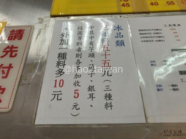 なお、追加するトッピングによって価格が上がる模様。芋頭(タロイモ)、蓮子(ハスの実)、銀耳(白きくらげ)、桂圓(ロンガン)が含まれると、5元追加なのかな?