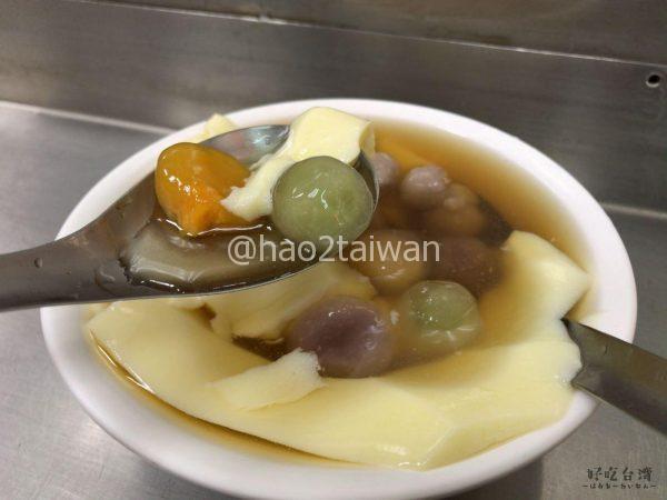 今回は、丁香豆花(たまご豆腐)を選び、トッピングに圓水晶、地瓜圓、玉圓の黄金トッピング。はい、モチモチQQづくしスペシャルです。