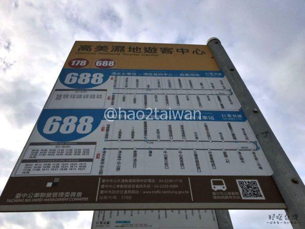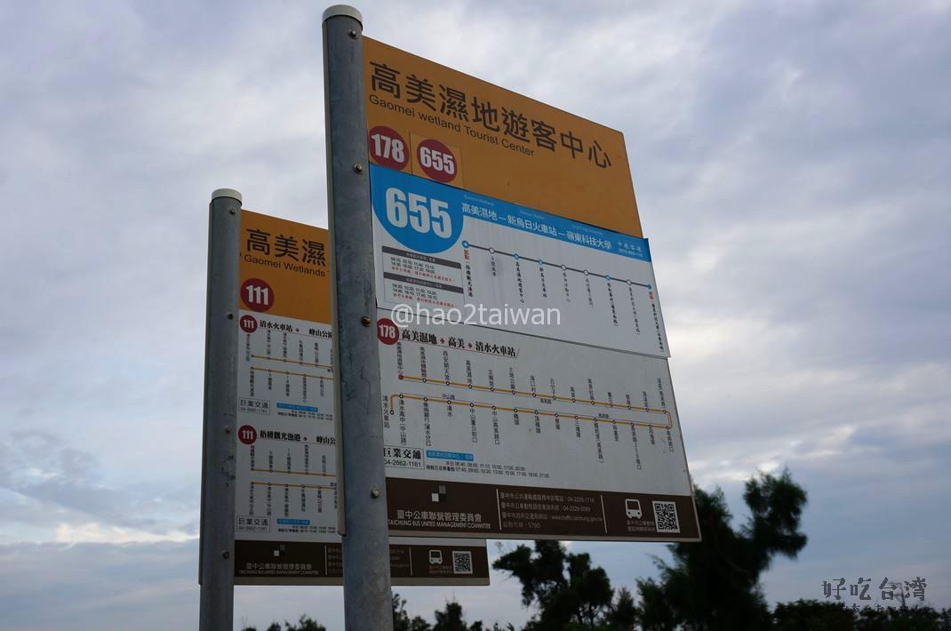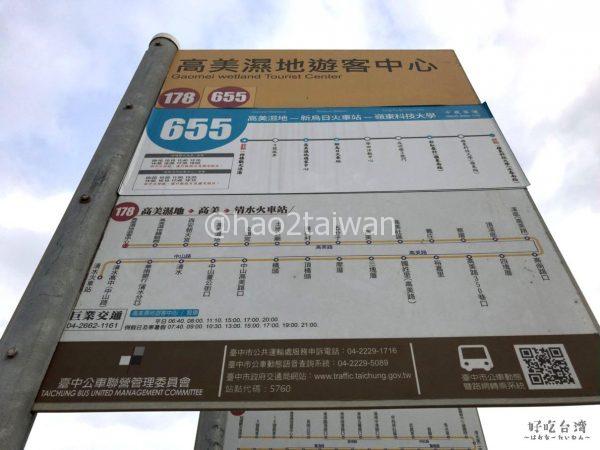 655(中鹿客運)の1路線が高美濕地近くにある高美濕地旅客中心を発着し、台湾鉄道の新烏日車站(高鐵台中駅)に停車します。