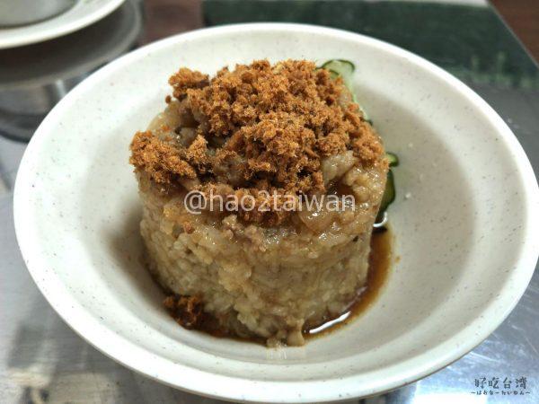 こちらは筒仔米糕。台南発祥の円筒状に蒸したおこわ。45元なり。