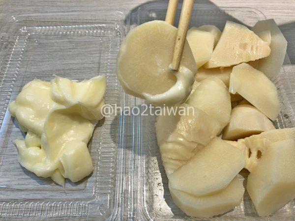 そしてタケノコから感じられる味が弱いので、台湾マヨネーズをこのように付けて食べるわけですが・・・。