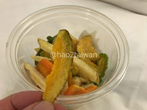仕方ないので、成田空港で購入した野菜スナックを食べてみるも納得がいかない。