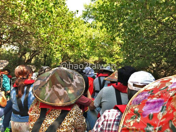 我先と撮影をする皆さん。もちろんぺちおも同じように撮影中。しかし、頭の上すぐに枝が迫る場所が所々にあるので、立ち上がっての写真撮影は命懸け(?)です。