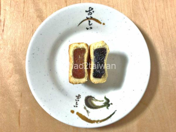 なお、右の写真は桂圓酥と愛文芒果酥を半分に切った際の切り口です。左のオレンジ色に近い餡のものが愛文芒果酥、右の色の濃い色の餡のものが桂圓酥になります。