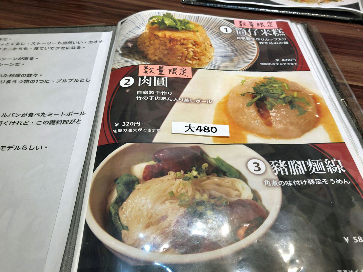 さて、期待の料理は、メニューをご覧ください。肉圓は480円。台湾の飲食店でお馴染みの筒仔米糕(おこわ)も480円です。台湾小吃っぽい値段設定ですね!
