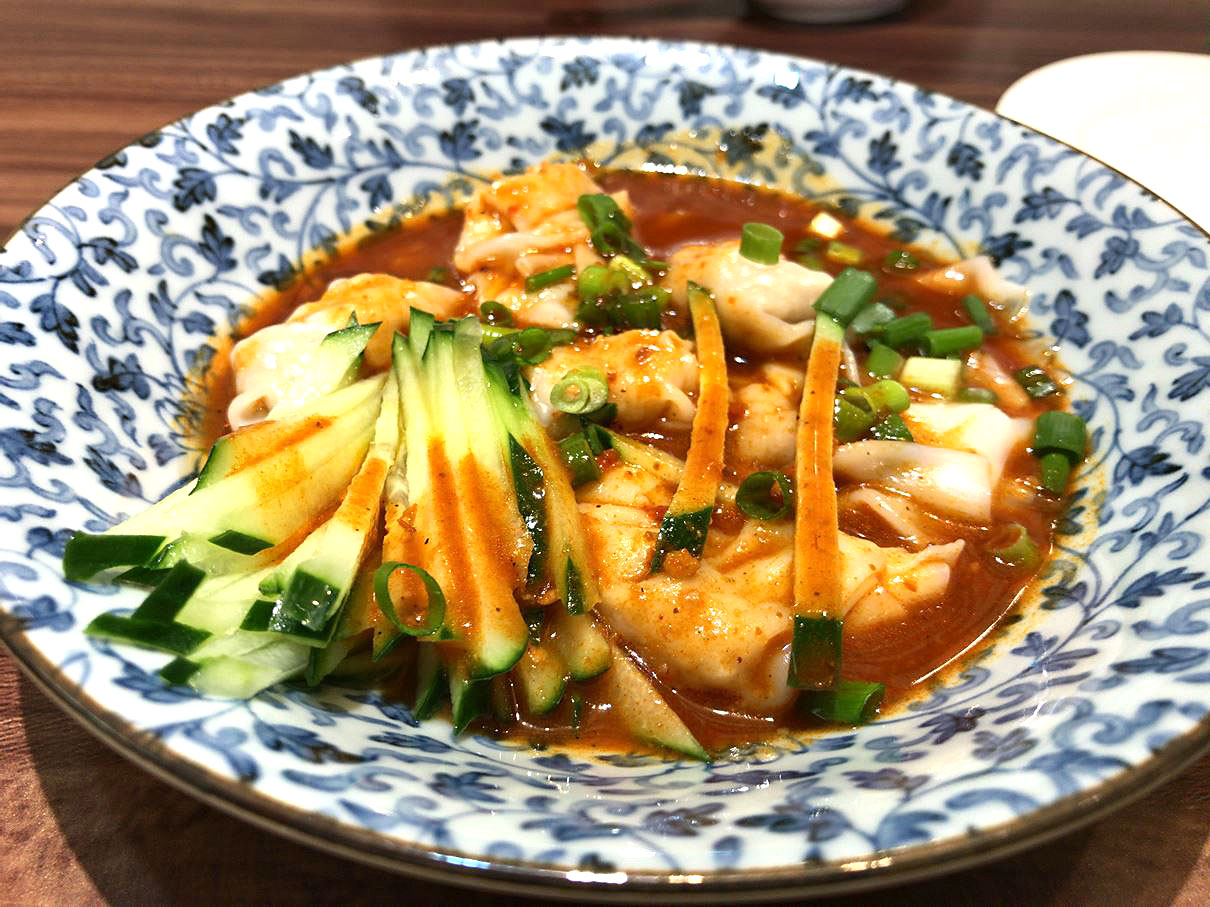 プルプルワンタンが酸味のあるピリ辛タレに浸されています。ぺちコンビ的にかなりの推しです。つるつるっとした喉越しと、暑い夏にピッタリの味付けにハマります。