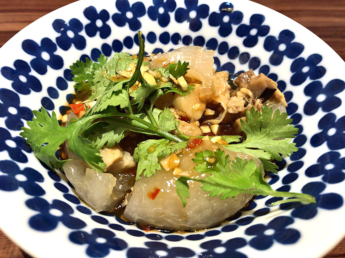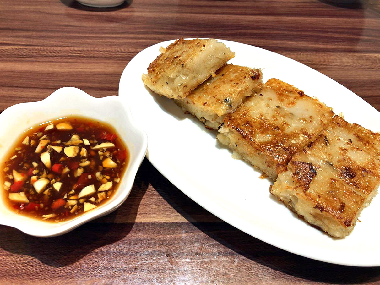 ふんわりホクホクの大根餅を甘酸っぱ辛いタレにたっぷりつけていただきます。