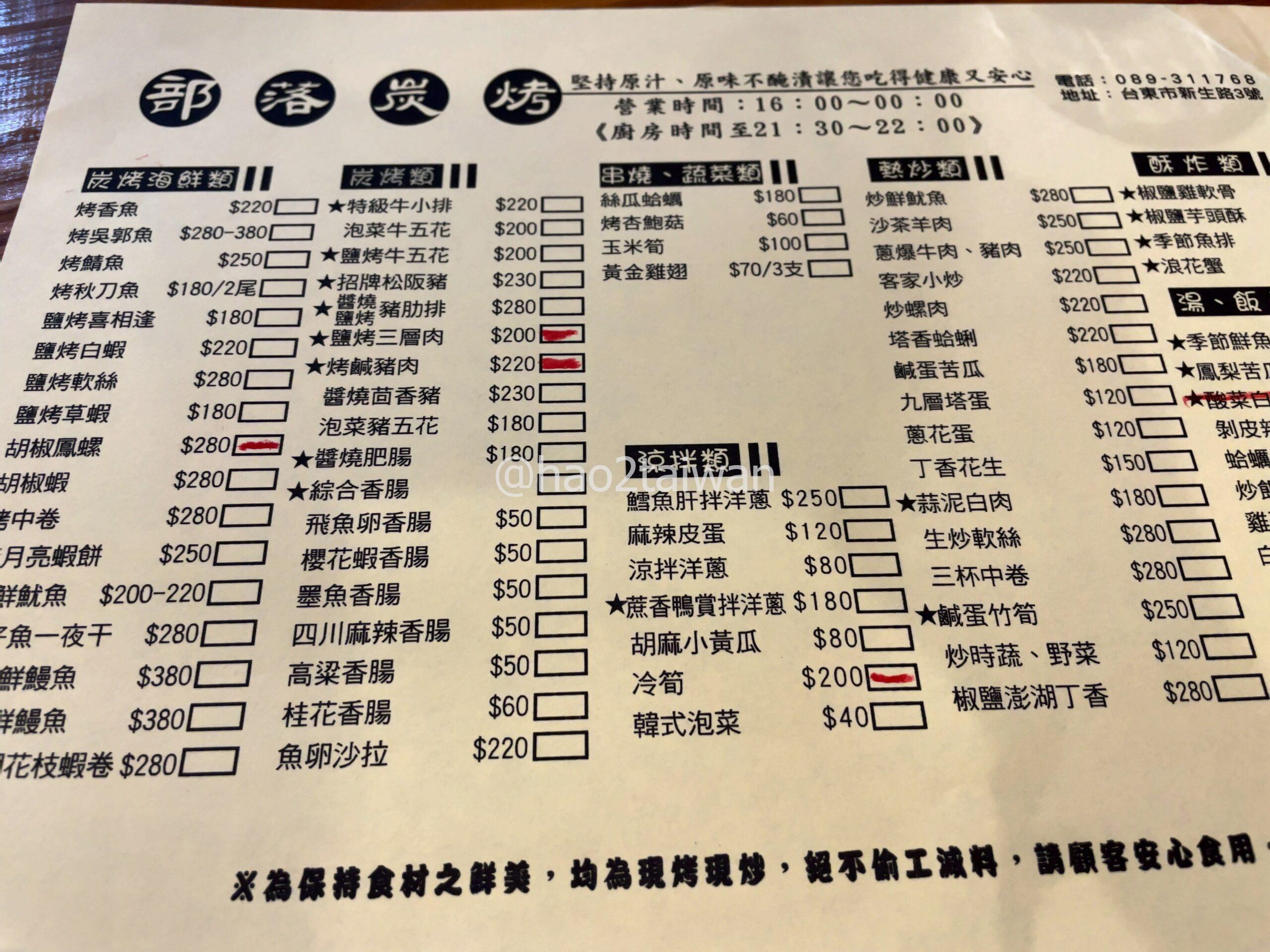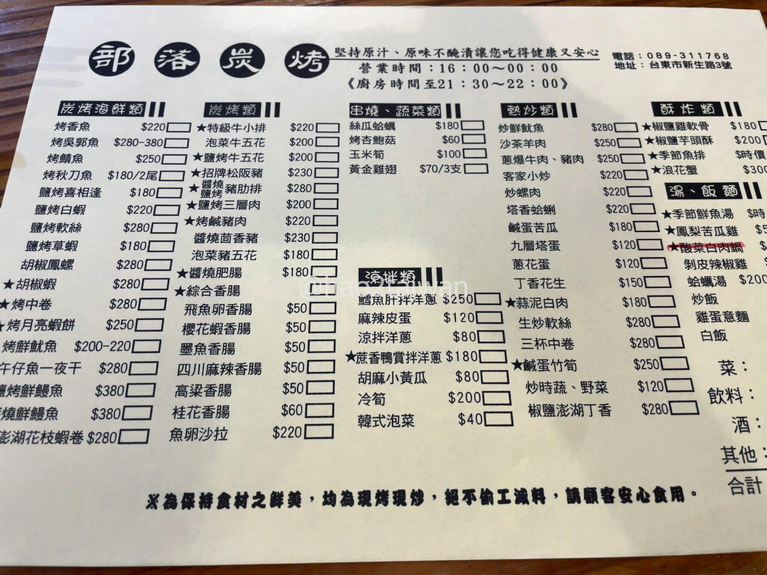 部落炭烤のメニュー表(台東・炭烤・熱炒)