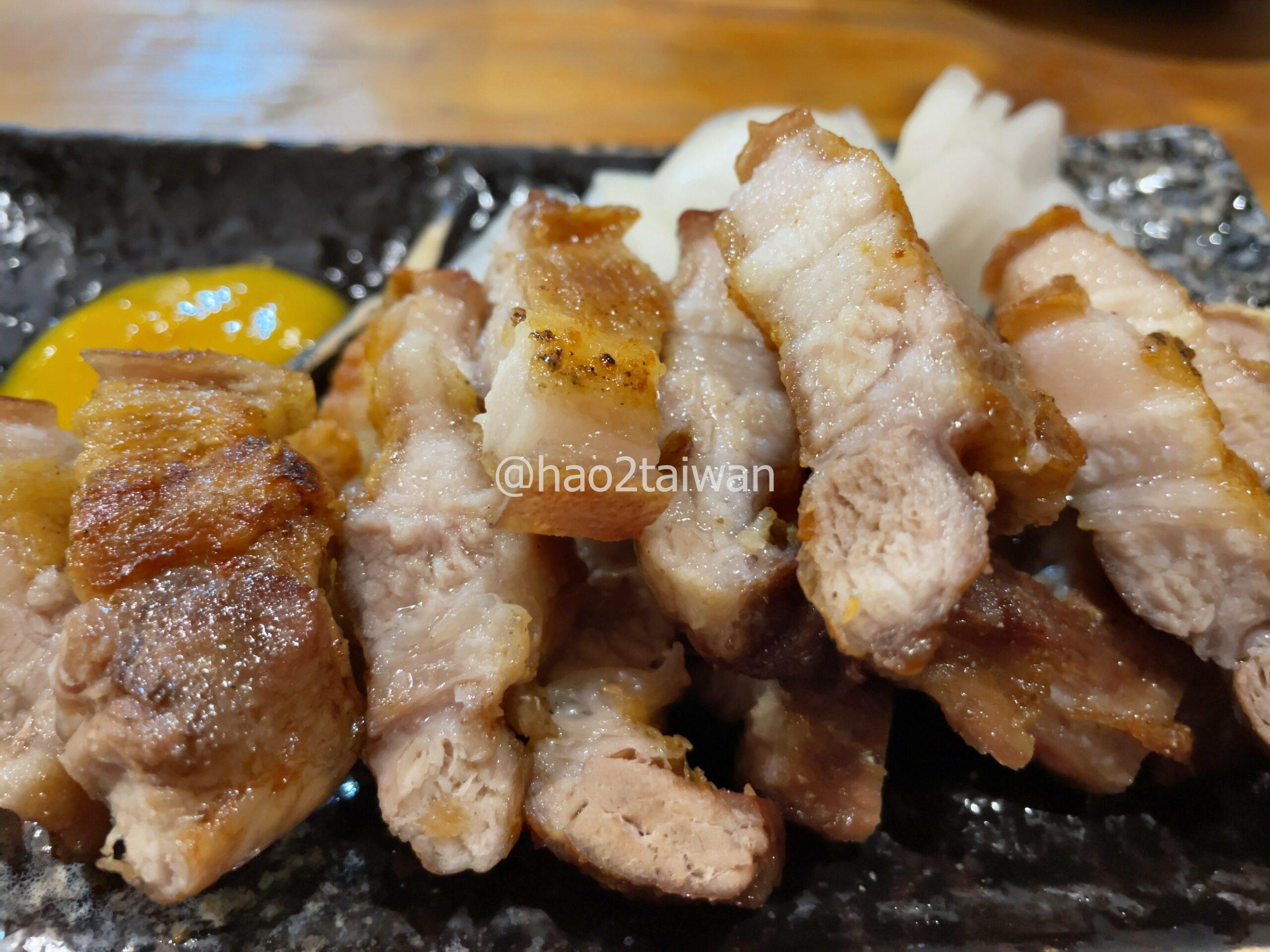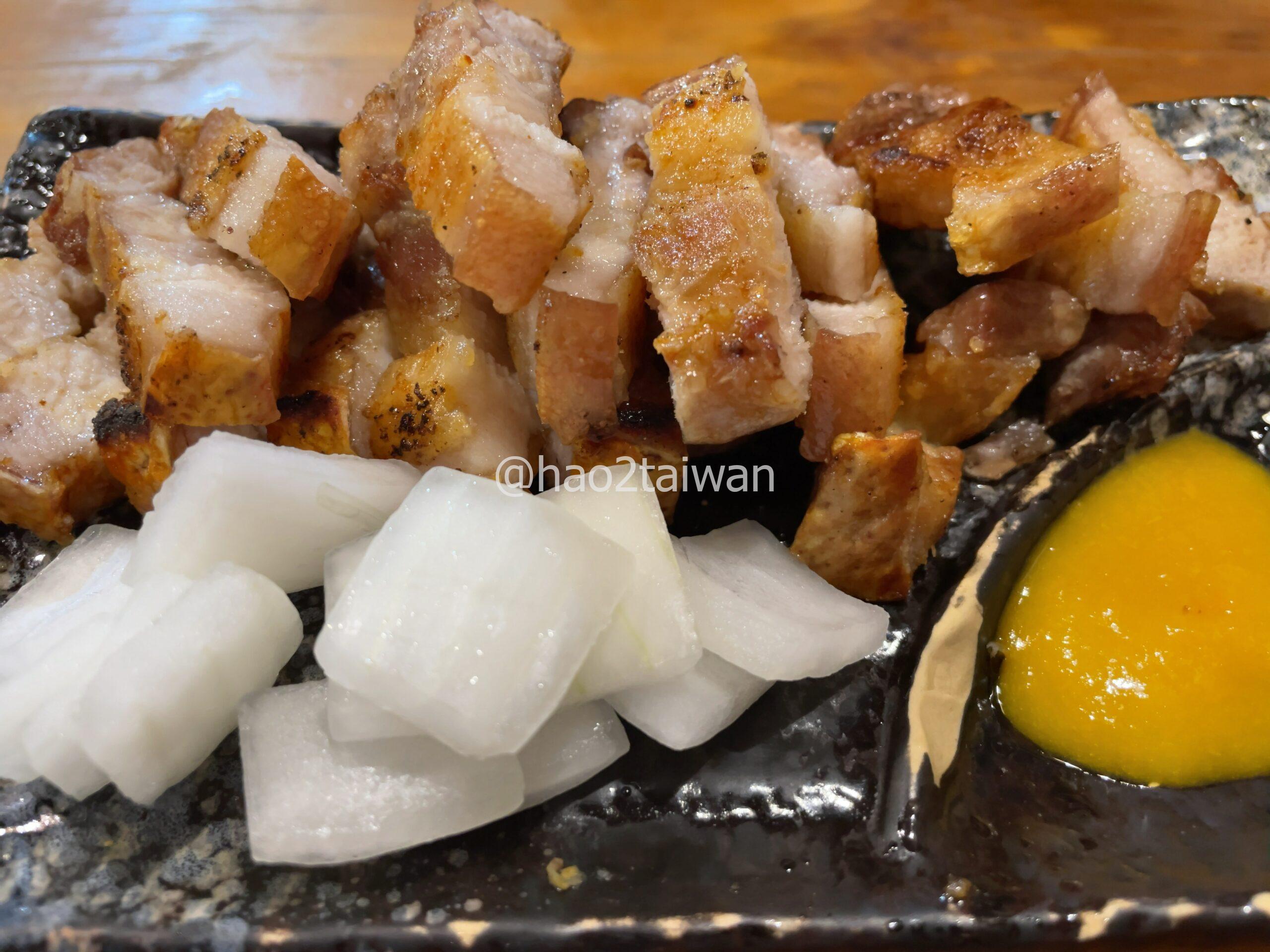 豚肉 → 金桔醬 → にんにく → 玉ねぎ。こういう順番で食べると、脂の甘さが立ちつつ、後味が軽くなって箸が止まりません。鹽烤三層肉(部落炭烤の炭火焼き豚バラ)